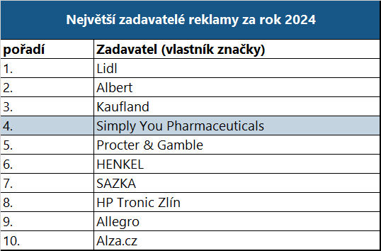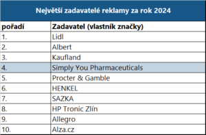 (Praha, 27. ledna 2025) – Podle dat společnosti Nielsen Admosphere patří Simply You Pharmaceuticals a.s. i za rok 2024 mezi největší zadavatele reklamy na českém trhu. S objemem inzerce v ceníkových cenách přes 2,4 miliardy korun se řadíme mezi čtyři nejvýznamnější inzerenty, přičemž v segmentu farmacie zůstávají naše investice nejvyšší. První příčku obsadil Lidl, následovaný Albertem a Kauflandem.